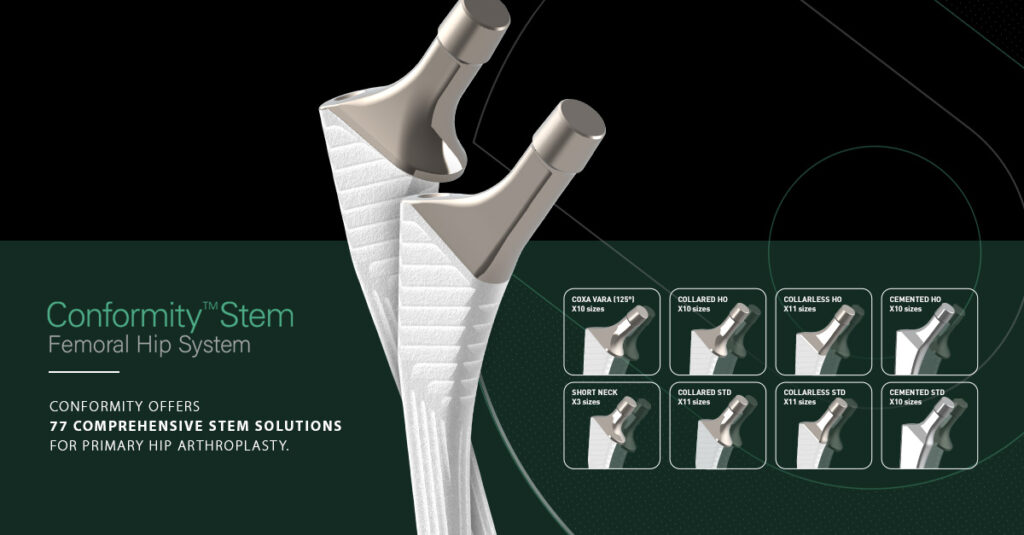 The Conformity Stem platform provides a comprehensive stem solution to hip arthroplasty surgery. Conformity is available in 77 stem options with 155μm of fully-hydroxyapatite (HA) coating, multiple neck options, collared and collarless features, and cementless and cemented options.